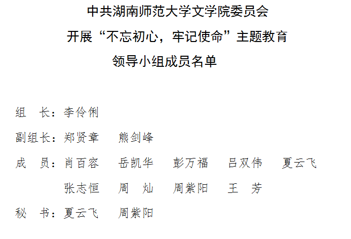 中共湖南师范大学五月天精品综合阁委员会开展“不忘初心,牢记使命”主题教育领导小组成员名单