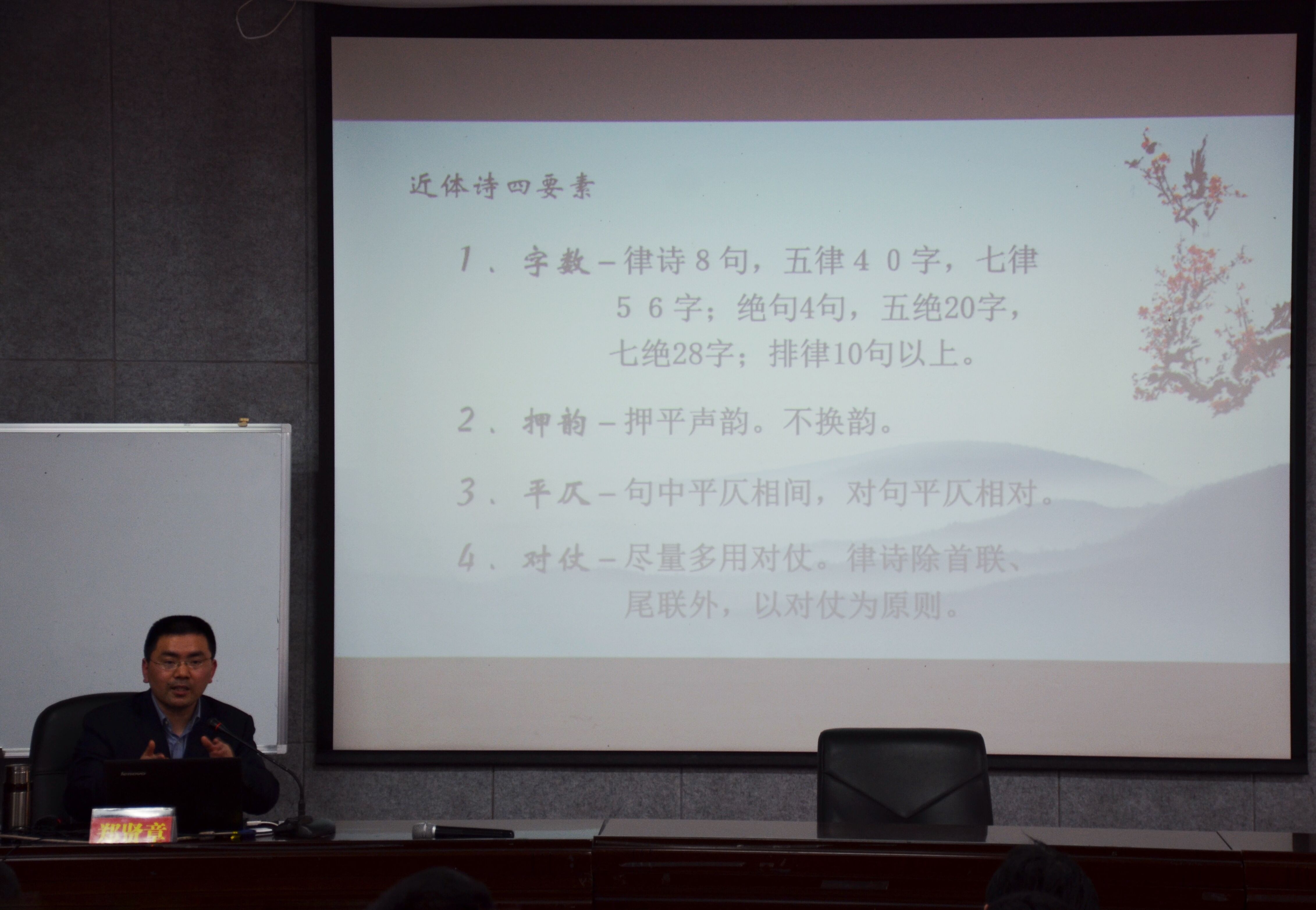 首先,郑贤章通过引用三句古文“不学《诗》,无以言”,“诗言志”,“诗,可以兴,可以观,可以群,可以怨”强调了古诗是一种修养。随后,郑贤章从押韵、平仄、对仗三个方面讲述了格律诗的规则,介绍了唐诗从格律上可以分为古体诗和近体诗,从字数上可以分为五言诗和七言诗。近体诗的四要素是:字数,押韵,平仄,对仗。