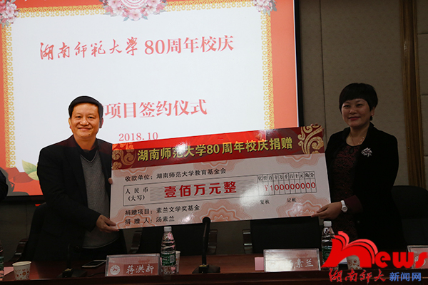 蒋洪新代表学校接受了捐赠支票,并为汤素兰授予捐赠荣誉证书。