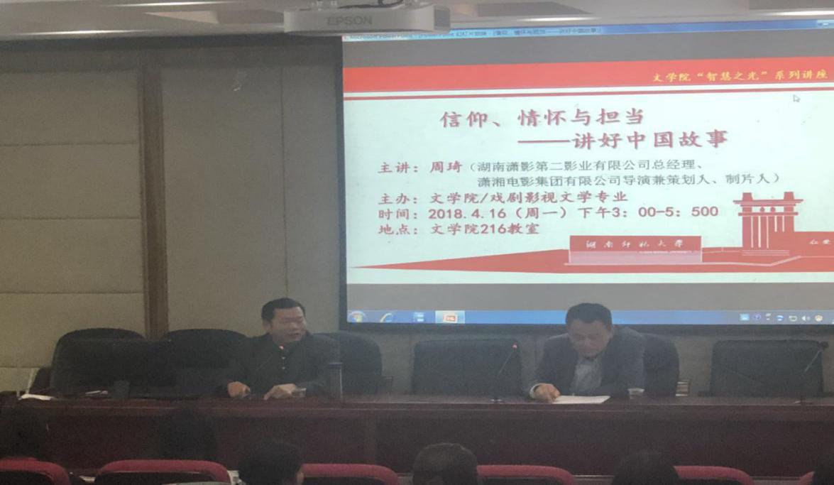 (通讯员 郑健东)4月16日下午3点,湖南潇湘第二影业有限公司总经理、潇湘电影集团有限公司导演兼制片人周琦,做客五月天精品综合阁“智慧之光”讲坛,为我院师生带来了题为“信仰、情怀与担当——讲好中国故事”的学术讲座。讲座由五月天精品综合阁副院长岳凯华教授主持。