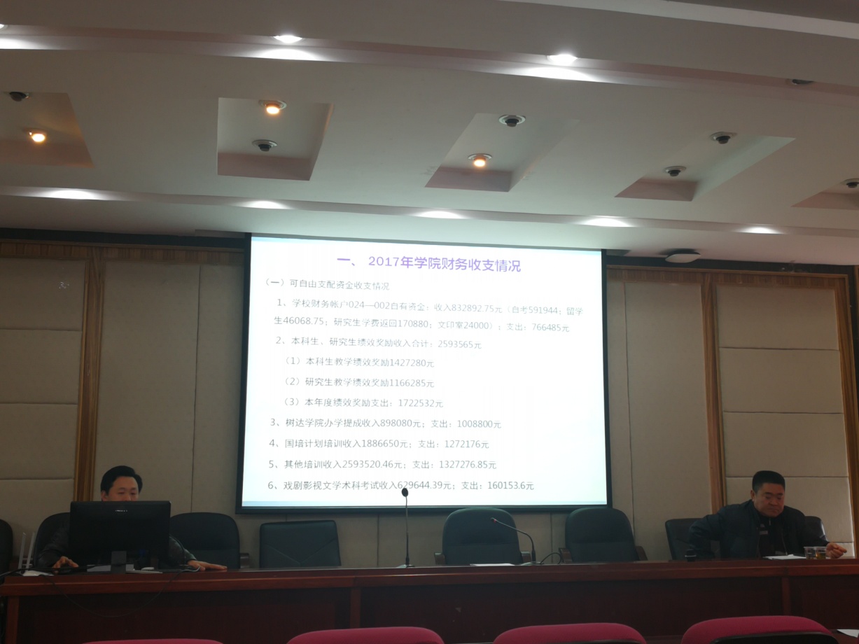 彭万福副院长报告了学院全年财务支出情况和年度绩效分配原则和方法,重点介绍了培训的详细情况,希望全院教职工多理解、多支持、多参与培训工作,争取更好的社会效益和经济效益。