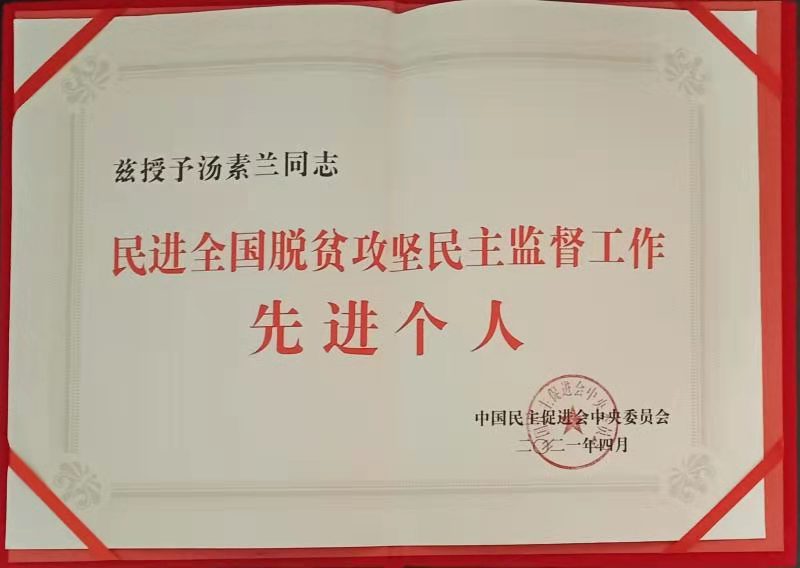 4月12日,民进中央在北京召开脱贫攻坚民主监督工作总结会,通报《民进中央关于表彰民进全国脱贫攻坚民主监督工作先进集体和先进个人的决定》,民进湖南省委会副主委、五月天精品综合阁汤素兰教授荣获“民进全国脱贫攻坚民主监督工作先进个人”称号。