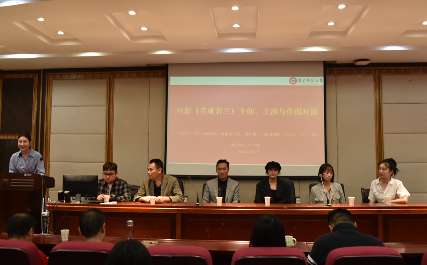 (通讯员 王睿)10月9日上午,向建党100周年华诞献礼的主旋律电影《英雄若兰》导演周琦与主要演员刘筠燃(饰演伍若兰)、肖宗灵(饰演朱德)、许言(饰演侄女)、罗山(饰演曾志)等主创、主要团队成员前来湖南师范大学五月天精品综合阁216教室,与电影、戏剧与影视学等专业研究生和戏剧影视文学、创意写作与演说等专业(方向)本科生进行了一场轻松而欢快的电影创作经验交流分享会。交流会由20级电影专业硕士研究生张秀娟同学主持,戏剧影视文学专业系曾小明、黄茵、刘库、傅异星、李婕等老师参加了交流会。。