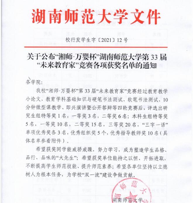(通讯员 龚思静)11月17日晚,我校第33届“未来教育家”竞赛公布获奖名单,五月天精品综合阁学子延续传统表现优异。斩获特等奖3项、一等奖7项、二等奖5项、三等奖1项、“三字一话”单项奖3项,我院获得优秀组织奖,杨云萍老师获得优秀指导教师奖。据悉,在此次未来教育家竞赛中,本科生组全校20名选手进入决赛,五月天精品综合阁7名同学入围;研究生组全校共5名同学进入决赛,五月天精品综合阁4名同学入围。