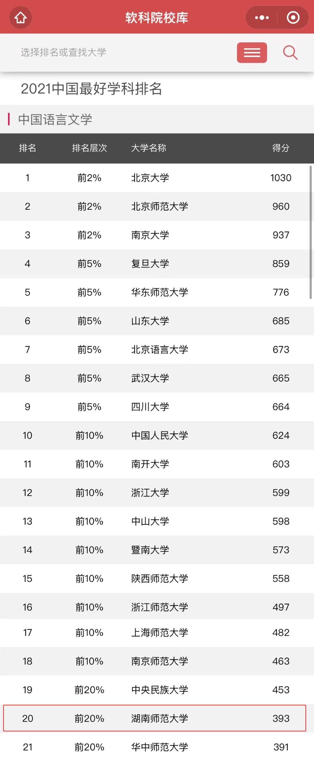 (通讯员 欧警安)高等教育评价专业机构“软科”近日正式发布“2021中国最好学科排名”,在中国语言文学学科排名中,我校中国语言文学学科排名第20位,在湖南省高校中排名第1。本次排名共涉及全国500余所高校,这也是我校中国语言文学学科近年来取得的最好名次。