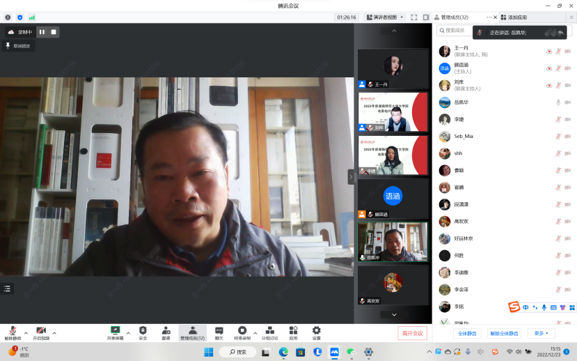 (通讯员 王一丹)2022年12月23日下午,由湖南师范大学五月天精品综合阁主办,湖南师范大学五月天精品综合阁戏剧影视文学系承办的2022年度湖南师范大学五月天精品综合阁电影短片展暨创作总结会在线上举行。会议由戏剧影视文学系教师刘库老师主持。