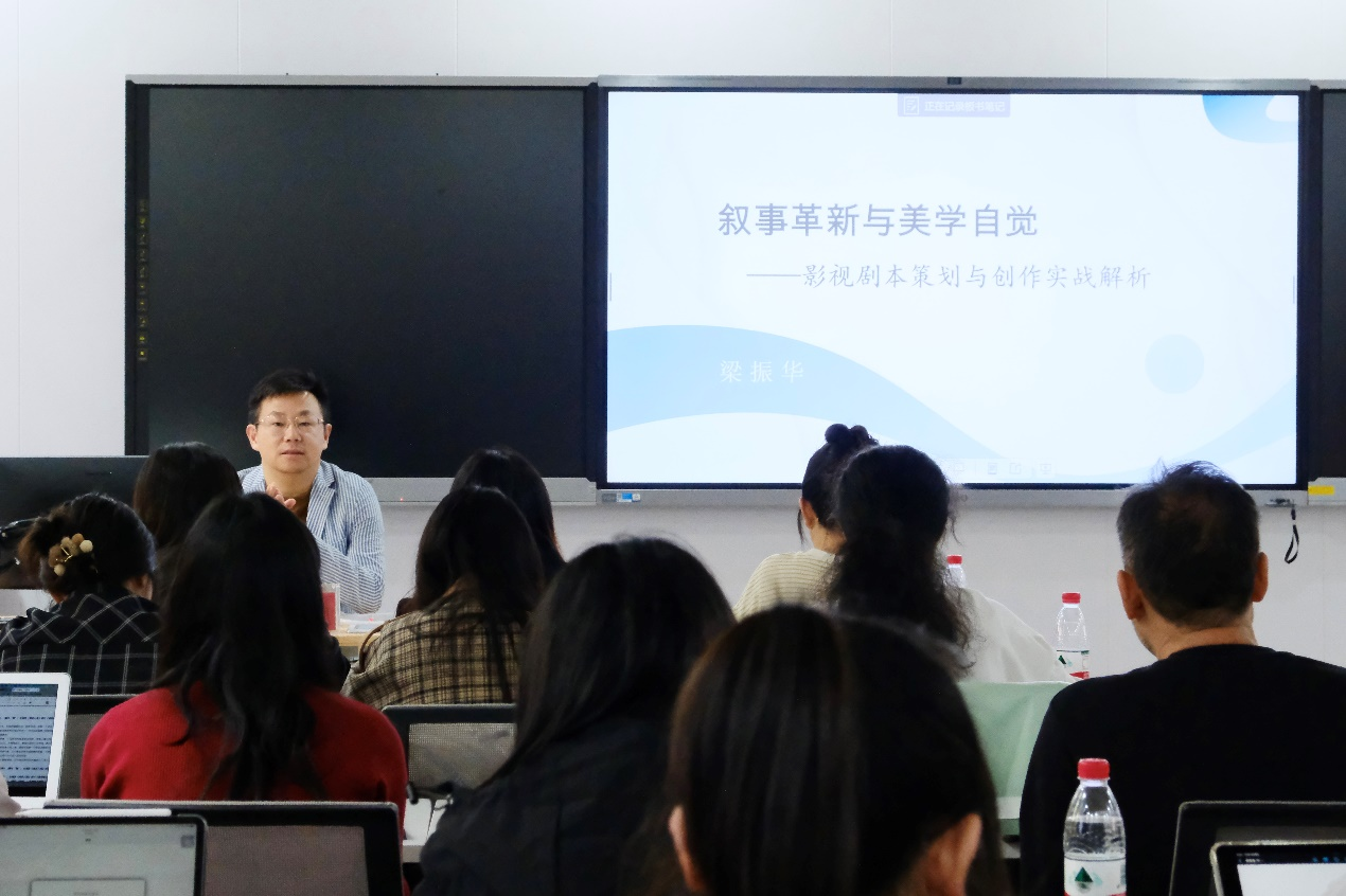 10月20日下午,在“叙事革新与美学自觉—影视剧本策划与创作实战解析”课堂中,梁振华提出“审美趣味更迭,但收视率并不代表艺术,无需‘轻易’改变自我创作。”他带领学生深入了解从创作到制作的专业现场“三重门”,从选题破题、讲述故事方式和美学形式等方面分析影视创作,举例并阐述了《在一起之生命的拐点》《澳门人家》《风吹半夏》等影视作品的具体内涵、表现方式。
