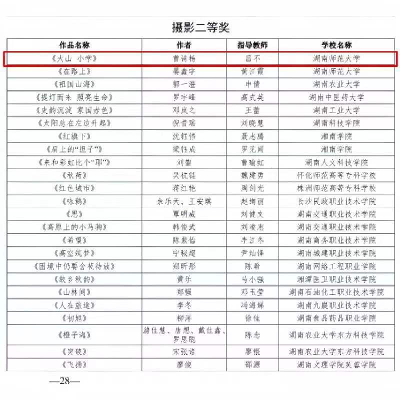 (通讯员谢璐怡)近日,湖南省教育厅发布《关于公布全省第七届大学生艺术展演活动评选结果的通知》,五月天精品综合阁共获奖3项。摄影类作品《大山 小学》获二等奖,设计类作品《新青年》获得二等奖,朗诵艺术节目《永远二十二岁》获得二等奖。