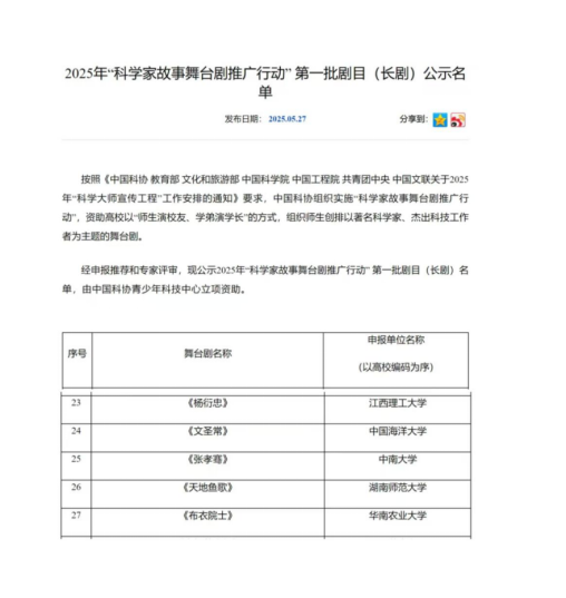 (通讯员:李媚芸,陈易甜)5月27日,湖南师范大学原创话剧《天地鱼歌》入选2025年“科学家故事舞台剧推广行动”第一批剧目(长剧)名单,由中国科协青少年科技中心立项资助,成为36部受资助剧目之一。《天地鱼歌》为湖南省高校首批入选剧目,在湖南率先实现零的突破,湖南师范大学校园文化建设又新增一优秀成果。