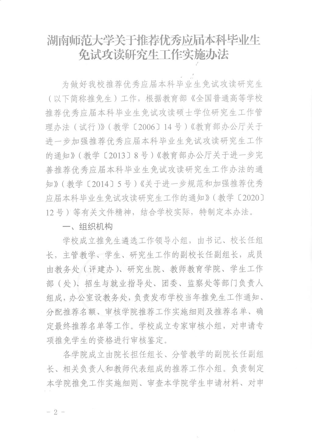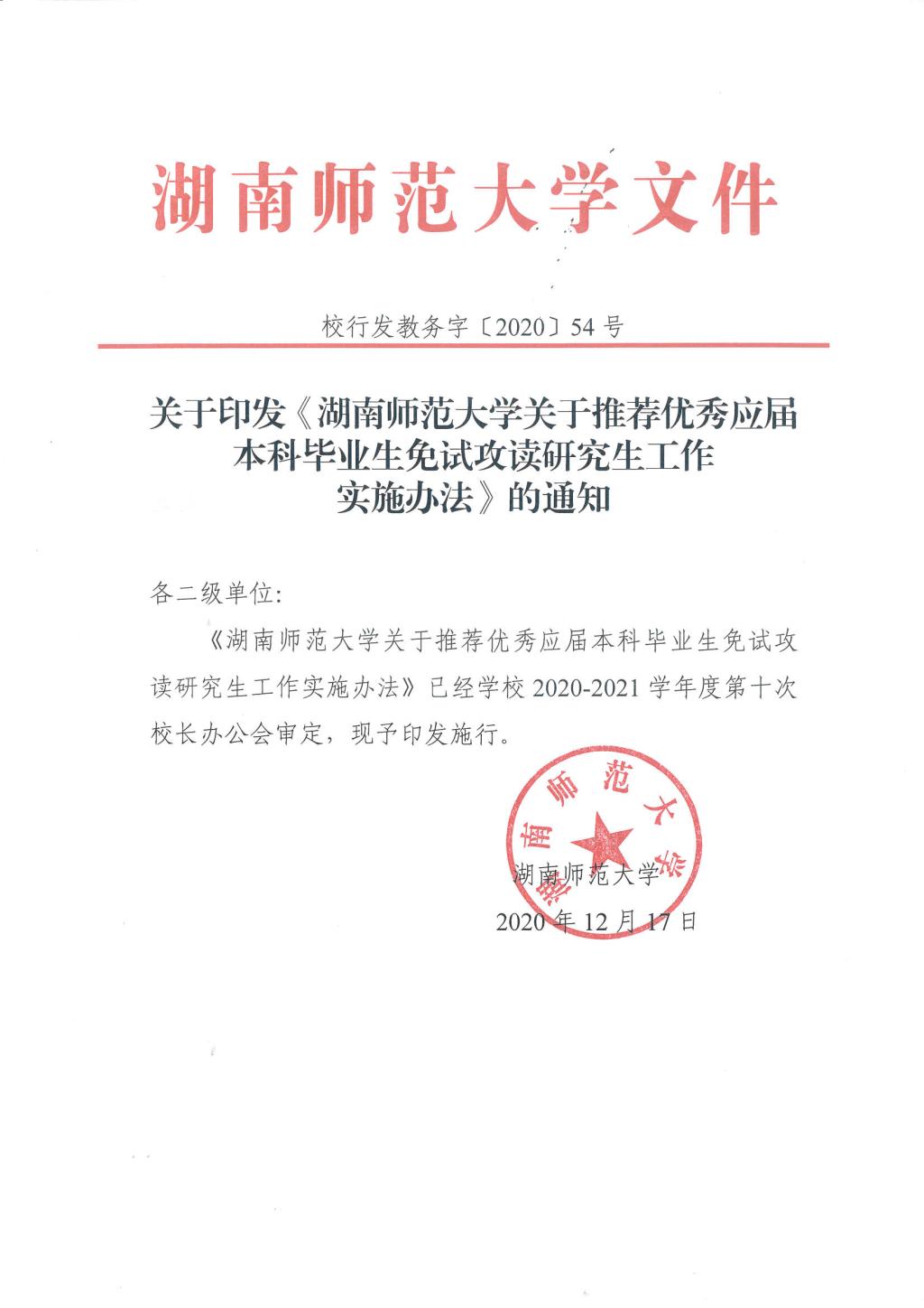 关于印发《湖南师范大学关于推荐优秀应届本科毕业生免试攻读研究生工作实施办法》的通知