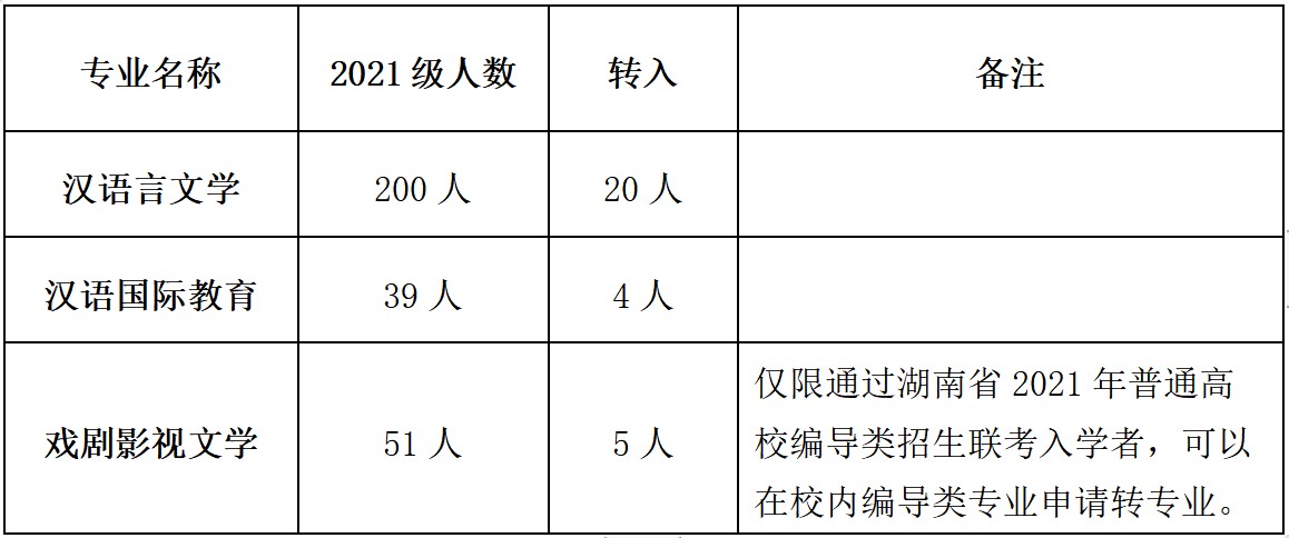 1.2021级申请转入汉语言文学专业的学生,要求在校学习期间,身心健康,品行表现良好。符合学校《关于做好2022年本科学生转专业工作的通知》中的条件,且湖南省内生源学生高考语文成绩110分以上(含110分),外省生源学生自己提供单科成绩换算依据。