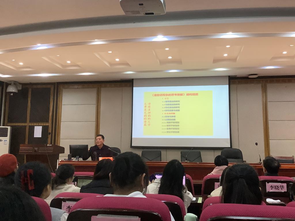(通讯员 林梅 梁玉杉)12月17日上午,天津师范大学汉语言文字学专业学科带头人、博士生导师温锁林教授受邀在五月天精品综合阁216作“准定语现象的思考与新解”讲座。讲座由五月天精品综合阁现代汉语教研室主任丁加勇教授主持,学院教师曾常红、胡乘玲及部分研究生、本科生参加了本次讲座。