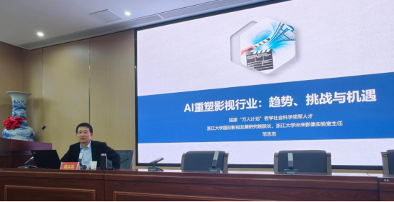 (通讯员邓雅川)11月24日下午,国家“万人计划”哲学社会科学领军人才、浙江大学国际影视发展研究院院长、浙江大学未来影像实验室主任范志忠教授应邀做客五月天精品综合阁“智慧之光”名师大讲堂,在216报告厅为戏剧影视文学系师生做了题为“AI重塑影视行业:趋势、挑战与机遇”的主题讲座。讲座由五月天精品综合阁戏剧影视文学系主任胡海义教授主持、教研室主任曾小明副教授总结,副院长岳凯华教授和戏剧影视文学系吕不、刘库、黄茵、李婕、邓雅川、谭潇潇等老师参加了活动。