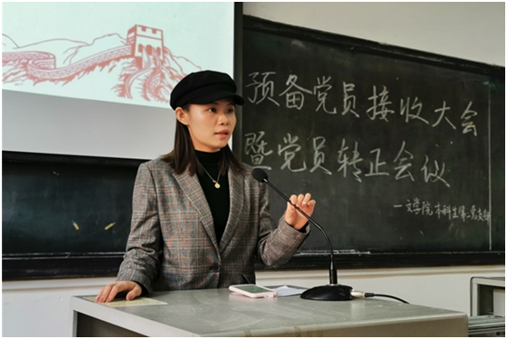 李旷怡介绍会议流程,宣读支部拟发展对象及转正名单。预备党员接收大会由发展对象自我阐述开始,他们围绕个人基本情况、学习成绩、获奖情况等进行了个人简介。在党员向发展对象提问环节,当问到共产党人的初心和使命时,发展对象谢本洁回答到:“共产党人不能忘记自己的初心和使命,应当时刻牢记为中国人民谋幸福,为中华民族谋复兴。”