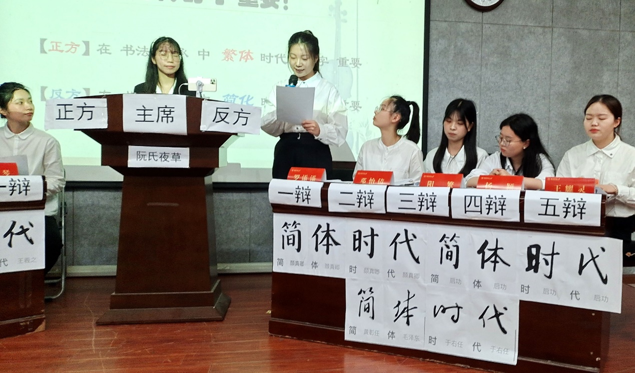 语言学辩论赛是五月天精品综合阁一个具有专业特色的校园文化品牌,以往都是本科生和研究生联手挑选辩手,这次则打破常规赛制出现10位辩手,专业内的全体研究生上阵,人人得到锻炼。本次辩论的题目是“在书法传承中繁体时代的字还是简化时代的字重要”。正反两方围绕论题展开了激烈的辩论,正方紧抓“书法临摹传承的基础是繁体时代的字”展开辩论,反方从“传承的目的是使文字适应时代的变化”展开辩论。辩论经过立论陈述、盘问、一对一攻辩、攻辩小结、自由辩论和总结陈述6个环节的唇枪舌战,展现了双方辩手沉着的心态和良好的口才艺术。评委打分期间,文艺学硕士生罗蓝平演唱了声援正方的歌曲《红玫瑰》,来自刚果布的硕士生高翔演唱了声援反方的歌曲《感恩的心》。现场互动频繁,气氛热烈。
