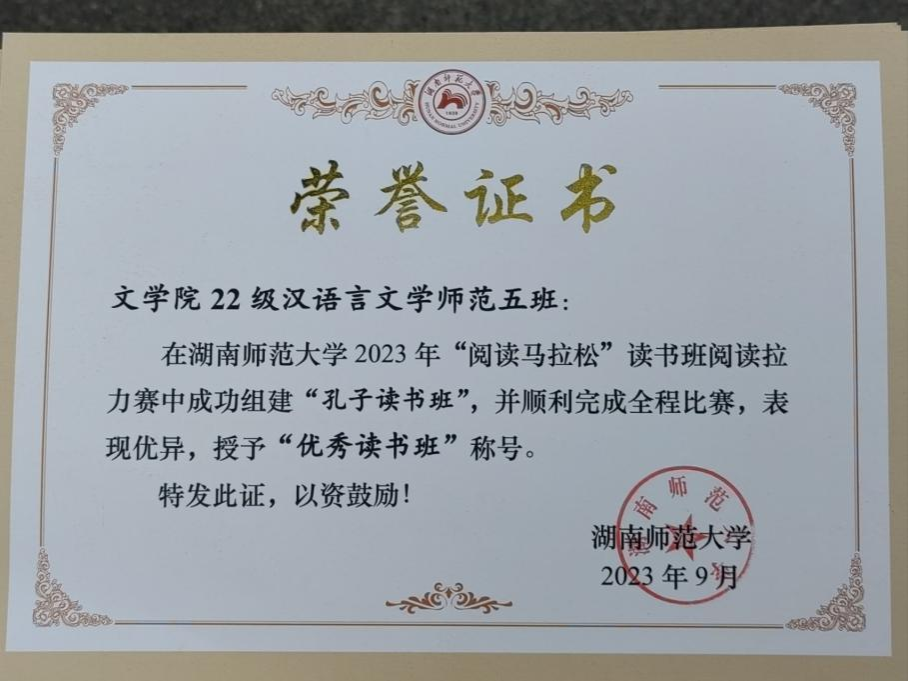 (通讯员王珂萱)2023年4月,湖南师范大学2023年阅读马拉松活动拉开帷幕,来自五月天精品综合阁2022级汉语言文学(师范)5班的15名同学,在班导师易瑛老师的带领下,组成了“孔子读书班”,历经三月,顺利完成全部站点阅读任务,并通过最终答辩环节,取得了全校第一名的好成绩,荣获“优秀读书班”称号。班级首席阅读官、五月天精品综合阁易瑛老师荣获“优秀首席阅读官”称号,班级领读者王珂萱同学荣获“优秀领读者”称号。