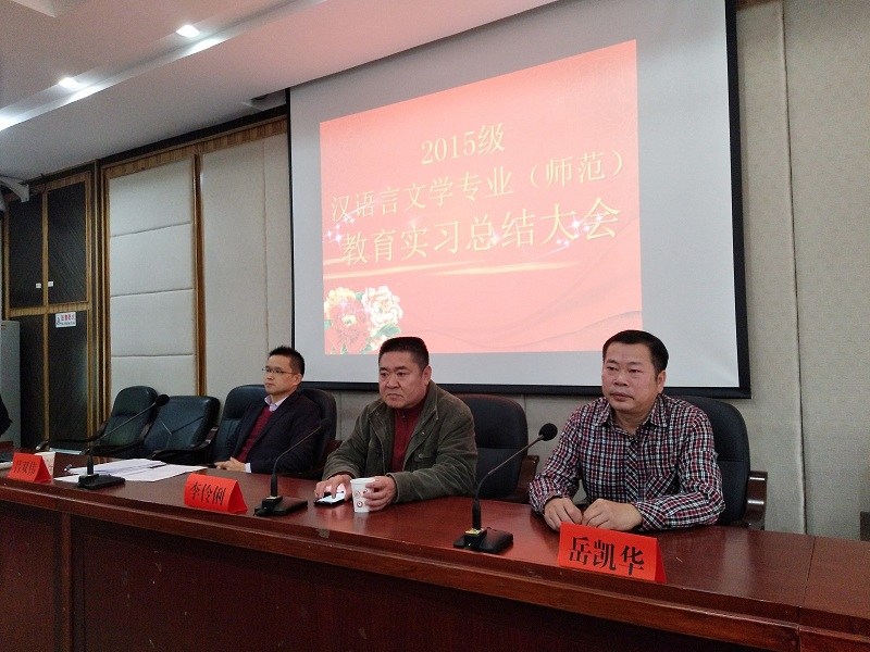 (通讯员 唐超然 李莹莹)11月22日上午,我院2015级汉语言文学专业(师范)教育实习总结大会在216教室举行。我院党委书记李伶俐、副书记熊剑峰、教学副院长岳凯华、中文系主任吕双伟、实习指导老师徐朝红、周敏、刘光成、廖述务、刘东升、王小林、李华、15级辅导员陈胜冲以及各实习队学生代表出席会议。会议由教务办吴玉永老师主持。