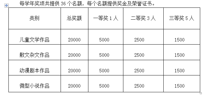 第二条 “素兰文学奖”共设儿童文学、散文杂文、动漫剧本、微型小说作品等4个方向的奖项,每学年评选一次,评选时间为每学年五月份。