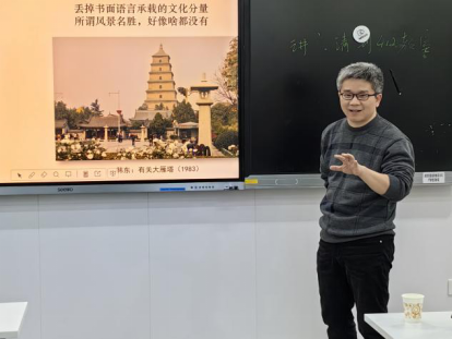 讲座中,汤拥华教授旁征博引,从柄谷行人的风景批评视角出发,与欧洲“风景的发现”相关理论结合,在理论阐释与视角对照中引出《沉沦》中现代风景的发现问题。他对东西方“风景”和“山水”进行了不同角度的对比,解构了《沉沦》中的风景发现问题,提出“《沉沦》中的漫步不只是西方风景的拟像,也是一场‘旨在重获认同的符号实践’”。他还对深度的美学悖论做出分析,就“风景的深度是素颜,而素颜就是深度的不可能性”的认知与师生分享观点。