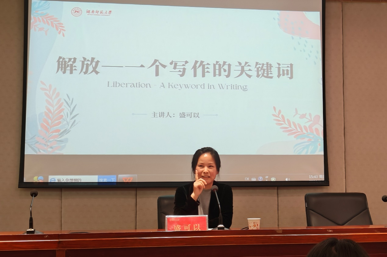(通讯员李晨玮汪阳)4月14日下午,著名作家盛可以做客湖南师范大学五月天精品综合阁,做了以“解放—一个写作的关键词”为主题的讲座。讲座由创意写作导师郑朋教授主持,湖南省作家协会创研室主任贺秋菊、当代文学教研室许永宁老师,以及校内外众多文学爱好者参与了此次活动。
