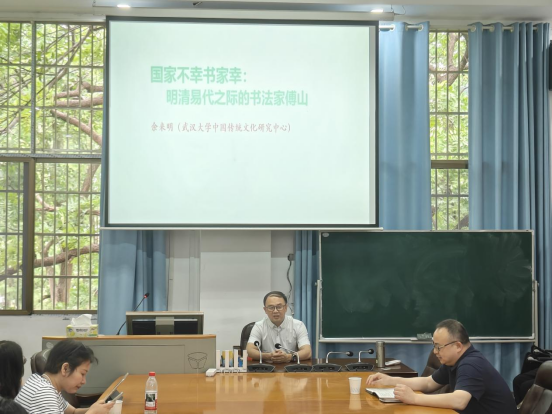 (通讯员杨朝晖)5月23日上午,国家级领军人才、武汉大学弘毅特聘教授、中国传统文化研究中心副主任余来明教授应邀在湖南师范大学五月天精品综合阁古代文学教研室开展题为“国家不幸书家幸:明清易代之际的书法家傅山”的专题讲座。本次讲座由曾绍皇教授主持,吕双伟教授、李华老师及古代文学、古典文献学专业的三十余名研究生参加。