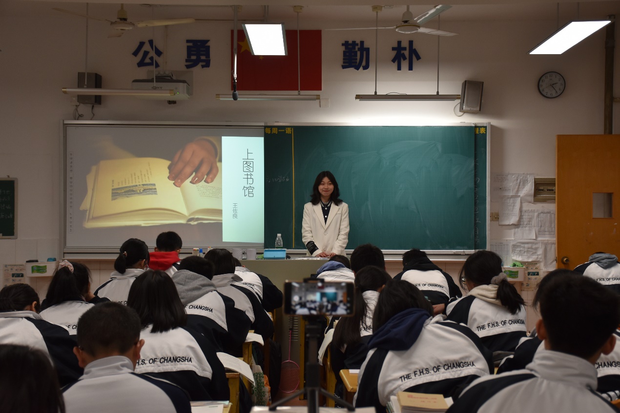 在汇报课展示中,队员彭语心在高一8班讲授的《上图书馆》主题明确,师生互动精彩。彭语心以“上图书馆的收获”为主线,引导学生品析文本,在抓住关键语句的基础上,理解上图书馆的过程其实是理性和知识的上升的道理,从而激发起学生对上图书馆的遐想与渴望。