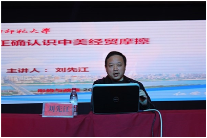 刘先江以“正确认识中美经贸摩擦”为主题,从“是什么,怎么样,怎么办”三个方面阐述了中美经贸关系对两国关系的重要影响。他首先梳理了近一年以来的中美经贸关系,全面讲解了中美贸易摩擦的演变过程。对于美国发动中美经贸摩擦的实质,刘先江引用由美国提出的“中国危险论”和“美国吃亏论”,深刻分析了问题所在,同时阐明了我国的立场和应对措施。刘先江特别强调,新时代大学生肩负着时代重任,要增强“四个意识”,坚定“四个自信”,把思想和行动统一到以习近平同志为核心的党中央决策部署上来,科学理性看待中美经贸问题。